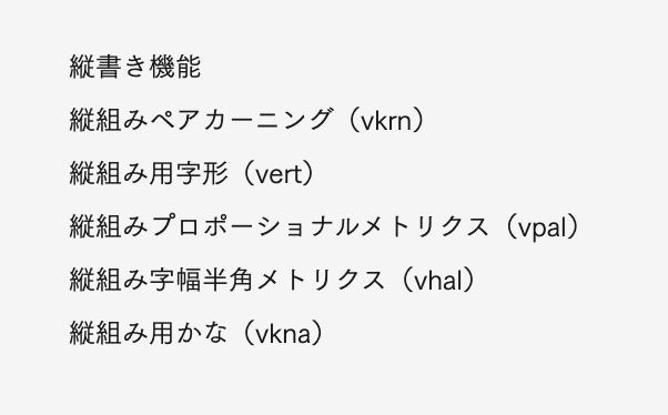日本のフォントメーカーは、縦組みにも手厚いです。縦の文字組みを美しく見せる「縦組みペアカーニング」など、縦書き機能を備えているOpenTypeフォントが多数リリースされています。