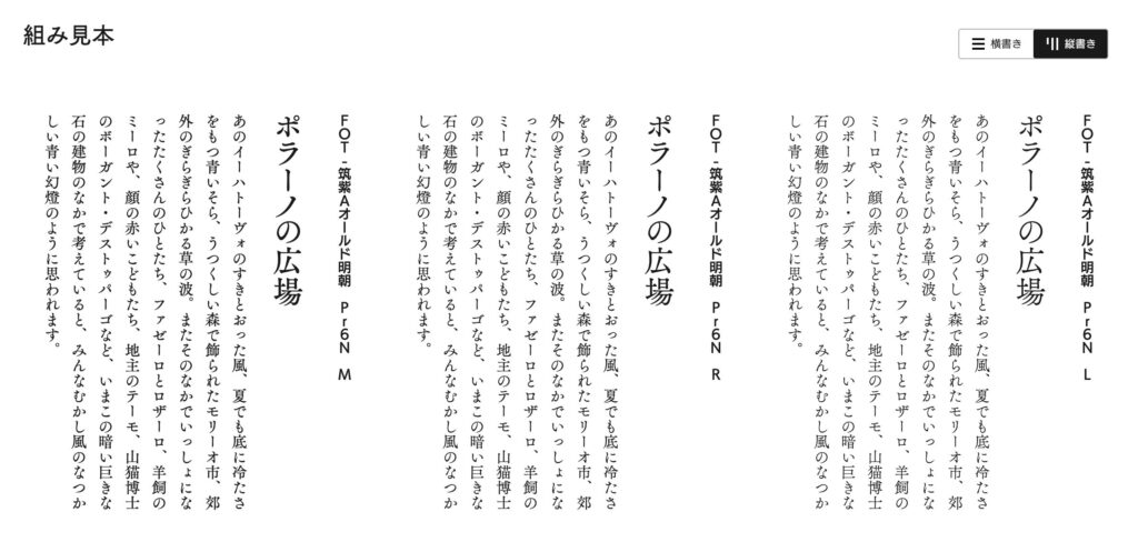 フォント配信サービスLETSのサイトでは、フォント閲覧時、文字組み方向の切り替えができ、プレビューで簡単に見られるように配慮されています。