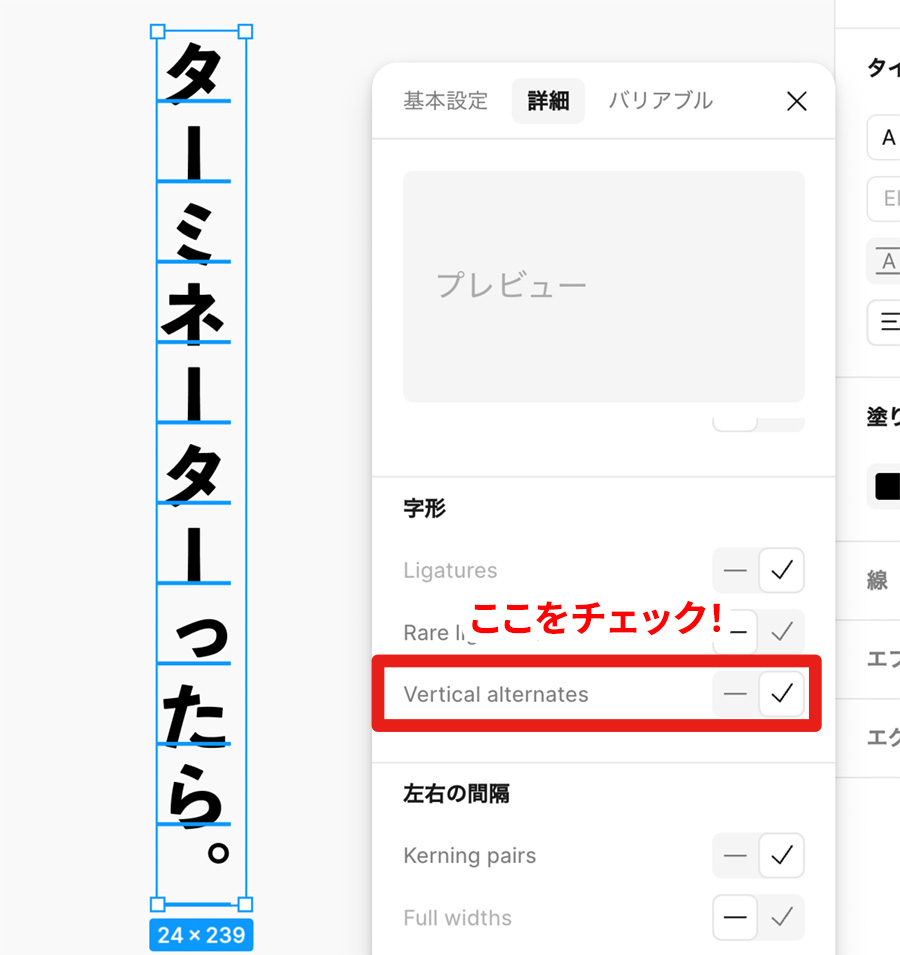 しかし、こちらも詳細設定を開き、Vertical alternatesにチェックをすると、なんと良い感じに変わってくれます。