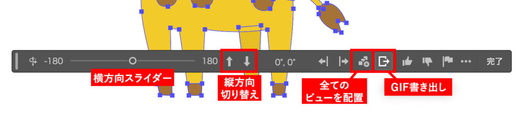 編集バーでは、角度の段階ごとの個別表示と全75点(元イラスト含む)整列表示、GIFアニメーションの書き出しなどができます。(2026年3月現在)