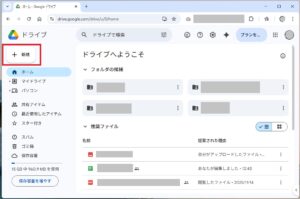 ドライブの左にある「+新規」をクリックして、表示されたメニューより「ファイルのアップロード」をクリックで画像ファイルを選択後、「開く」をクリックで画像がドライブにアップロードされます。