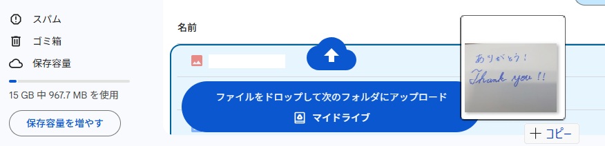 ちなみに「ファイルのアップロード」は、ドライブのファイル一覧上に画像をドラッグアンドドロップでもできますよ。