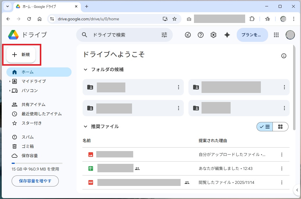 ドライブの左にある「+新規」をクリックして、表示されたメニューより「ファイルのアップロード」をクリックで画像ファイルを選択後、「開く」をクリックで画像がドライブにアップロードされます。