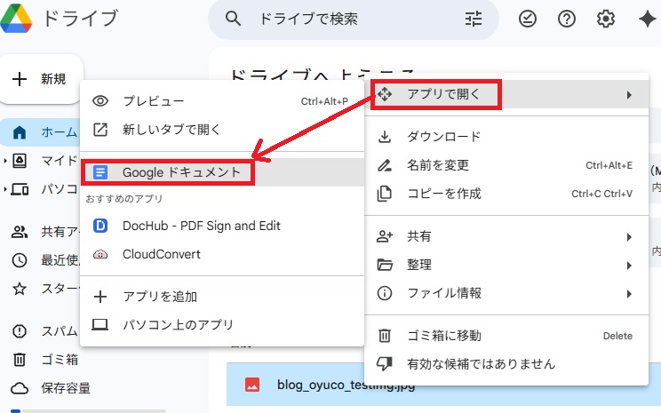 ドライブ上の一覧にて、アップした画像上で右クリックして「Googleドキュメント」をクリックで、「Googleドキュメント」を選択してGoogleドキュメントを開きます。
