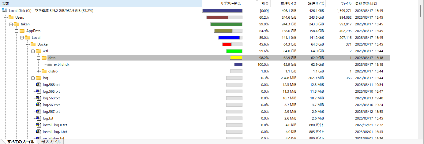 そしてWinDirStat確認した所Dockerで使用しているext4.vhdxというファイルが容量を食っていることに気が付きます。
