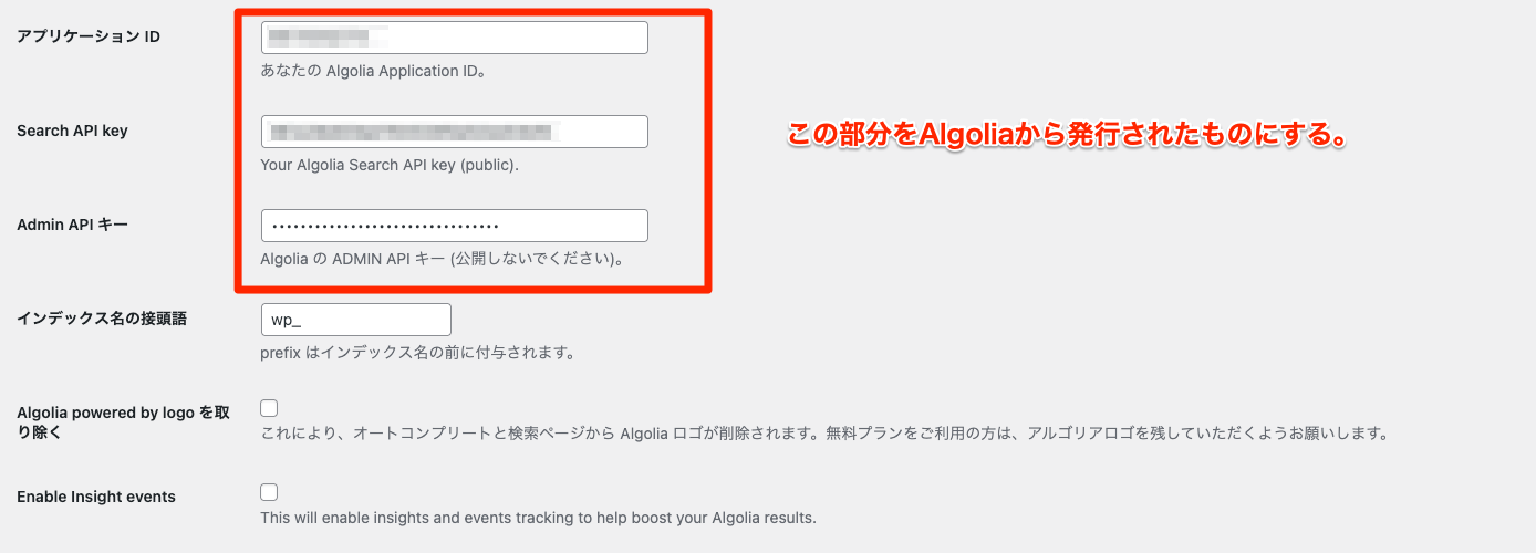 ※Algolia側の画面に「アプリケーションID」「Search API key」「Admin API キー」が表示されていると思います。
