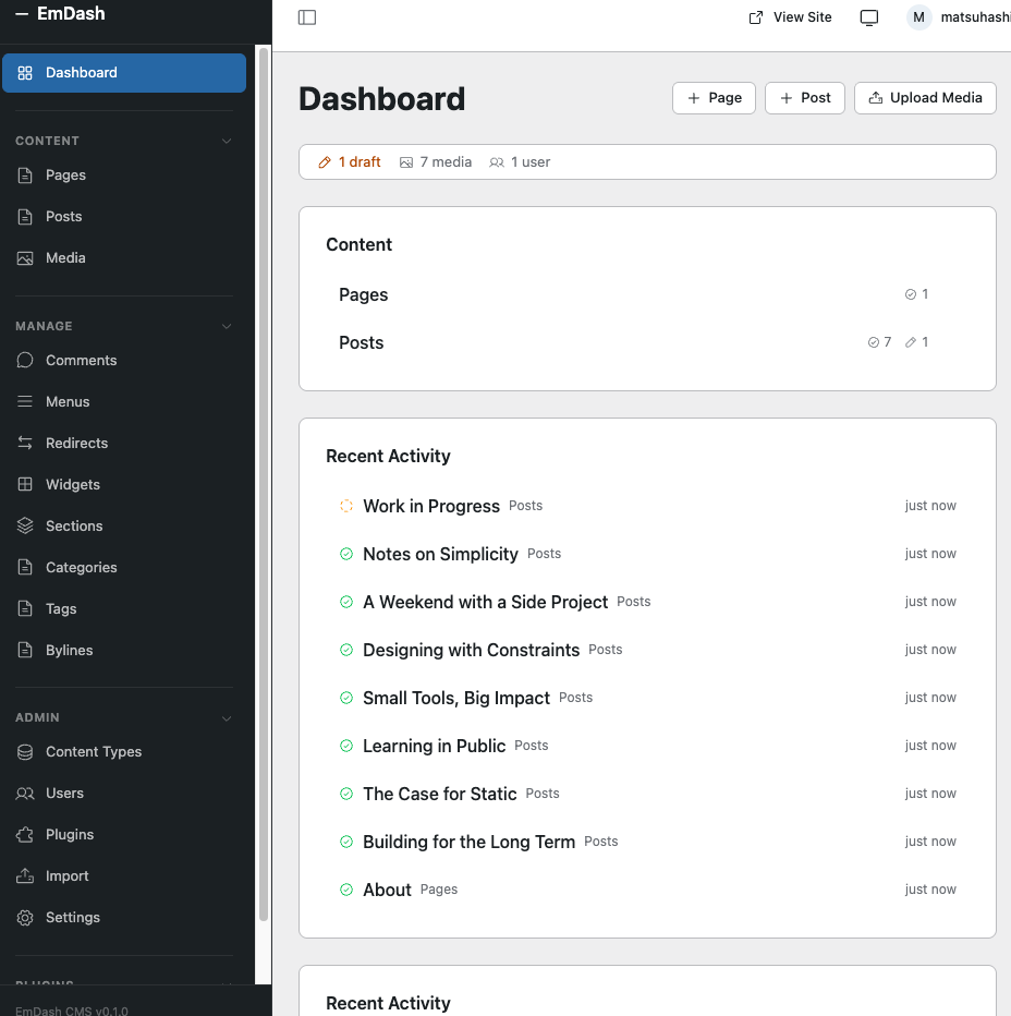 今回はブラウザからEmDashの管理画面を見てみましたが、WordPressそっくりな部分が多々ありました。