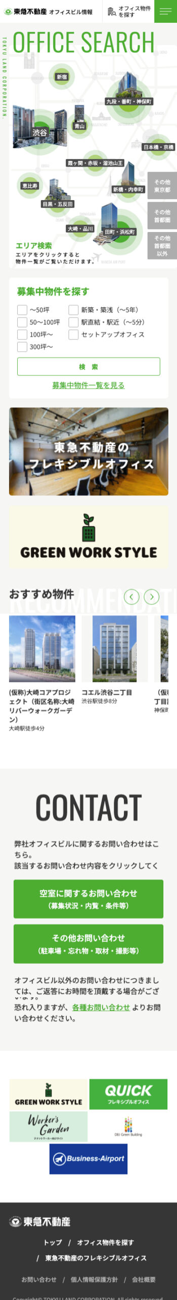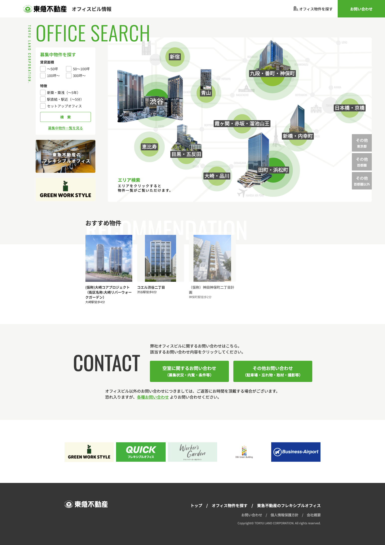 エリア(渋谷、霞ヶ関、五反田など)、賃貸面積、築年数、駅距離などの条件で物件を絞り込める検索機能を設計し、ユーザーが直感的に目的のビルにたどり着ける導線を実装。