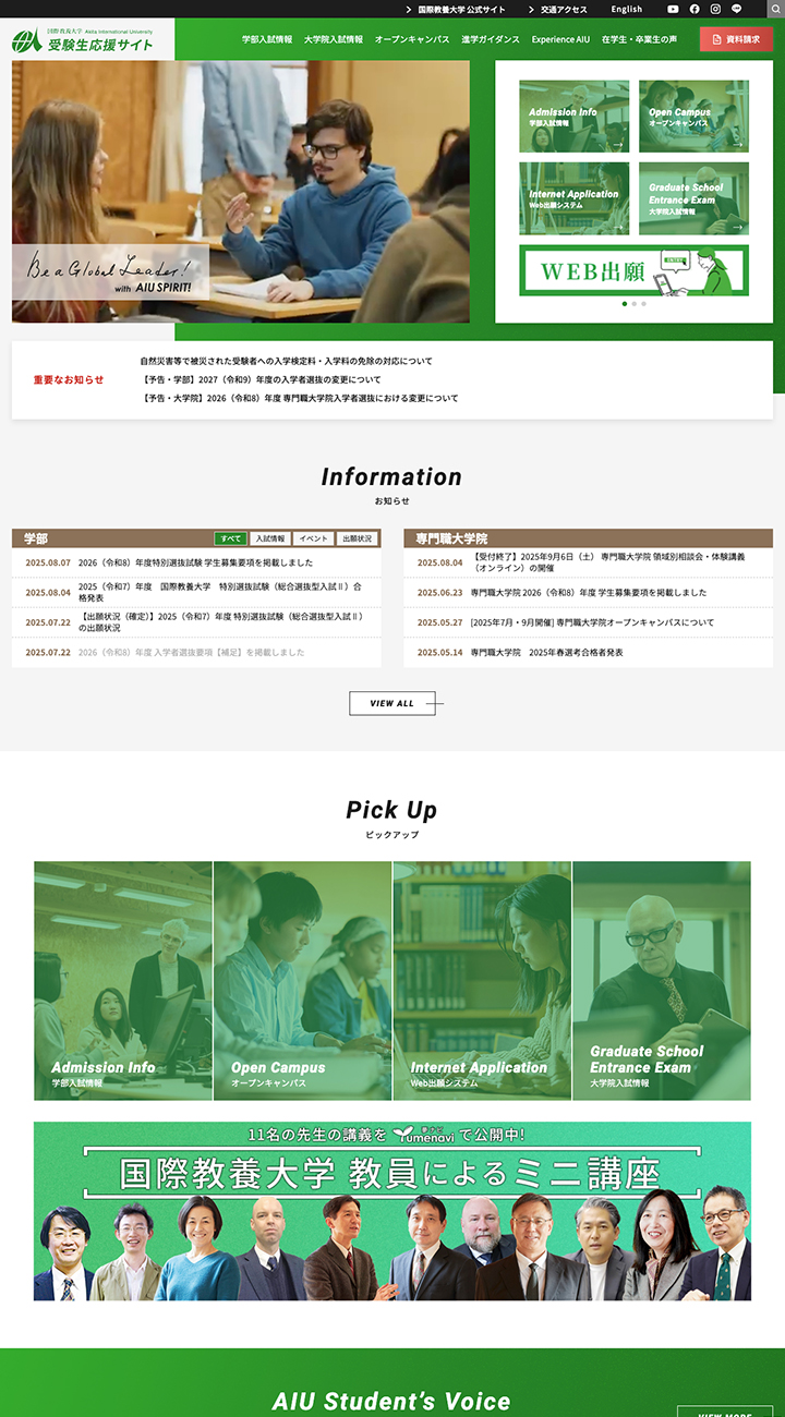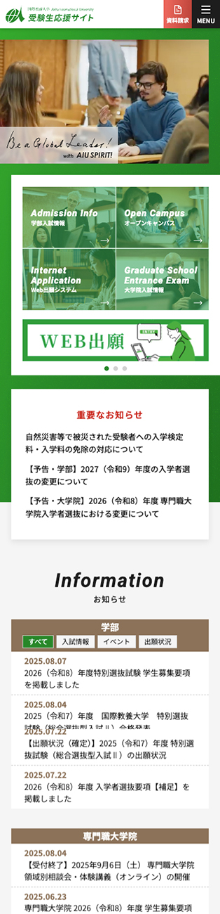 入試要項、出願フロー、学費・奨学金、FAQなどを体系的に整理し、受験生が直感的に必要情報へアクセスできる情報設計を実現。